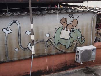 Check out the nice elephant painting on a magic carpet. Notice the colorful birds on the roof?