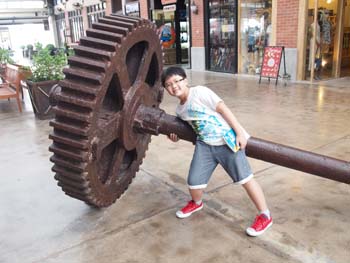 Aiken pretending to lift the huge gear piece.