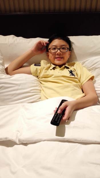 Enjoying the extremely comfy bed, in his words. That's it for Day 1.