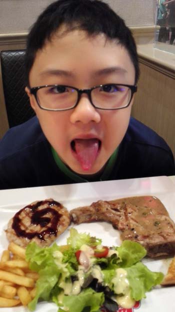 Chicken patty and pork steak for Aiken. He said the pork steak was tough.