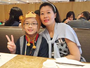 Waiting for our food.....starving already.....Aiken in his monkey hat.