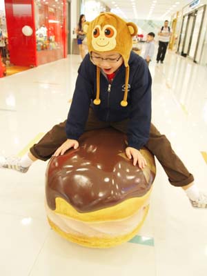 Aiken sitting on a huge eclair bench...haha