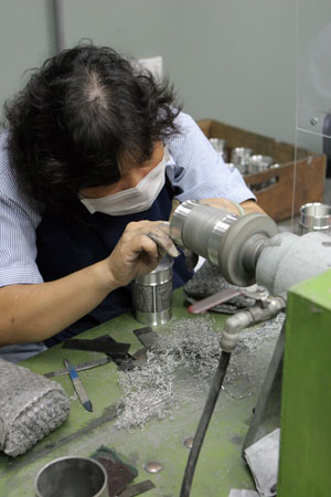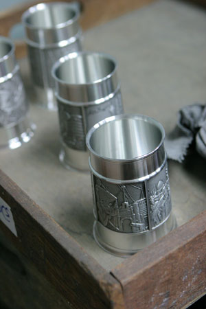 Polishing and shaving the interior of the cup. According to the guide, all the pewter shavings will be melted down and reused again to prevent any wastage.