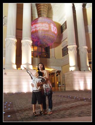 Took this pic of wife and Aiken at the Sofitel Macau LED Globe before we retire for the night. Last night @ Macau.