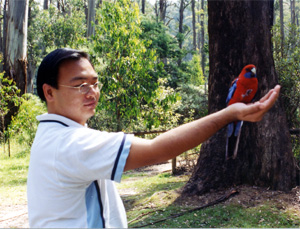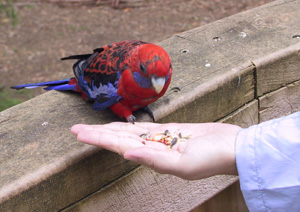 Remember I told you guys that these Crimson birds are so "tamed" that we can hand-feed them? Well, here is the proof. Quite interesting to see the bird fly down from the trees to your hand to eat the seeds.