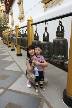 Angelia and Aiken taking a shot with the row of buddhism bells at the side of the compound.