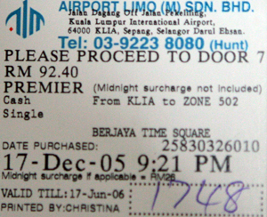 After an approx 45 mins flight, we arrived at KL. For those who are here first time and not on any package tour, pls remember to buy the airport limo transfer to your hotel from the Kuala Lumpur International Airport (KLIA). You will be able to see the counter after clearing customs and before you step out of the Arrivial Hall. The ticket will look something like the photo. The first time we came to KL, got conned to take those tout cabs and was charged a whopping RM200!!!!