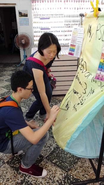 Somehow, due to the rain and crowd outside, we were the only group allowed to write our wishes on the lantern in the aircon comfort of the shop. Here's my boy writing his wishes for his PSLE results.